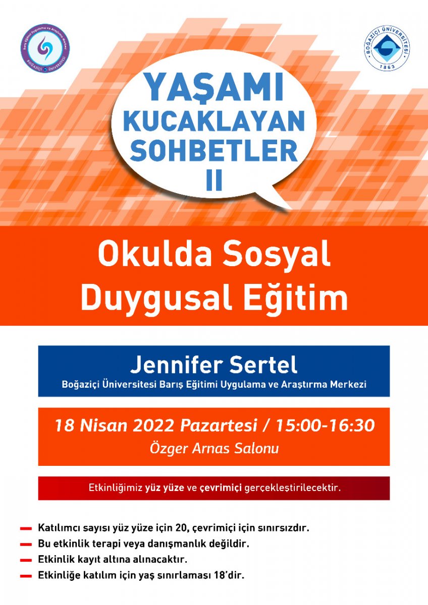 2007 yılında kurulan Boğaziçi Üniversitesi Barış Eğitim Uygulama ve Araştırma Merkezi üyeleri olarak Yaşamı Kucaklayan Sohbetlerin ikinci serisini düzenliyoruz. 2020 yılında Covid-19 pandemisinin ilk aylarında birlikte olmanın verdiği güçle, barış eğitimi anlayışı ve felsefesini temel alarak oluşturduğumuz içerik ve uygulamaları sizlerle paylaşmıştık. Serinin ikincisinde, sosyal duygusal yetkinliklerimiz geliştirme yolları, eğitim ortamalarında sosyal ve duygusal öğrenmeyi destekleme yolları, iletişim dili olarak barış dilini benimseme, ilişkilerde kabul ve çatışma dönüştürme, sosyal yaşamda sürdürülebilirlik konularını ele alıyoruz.